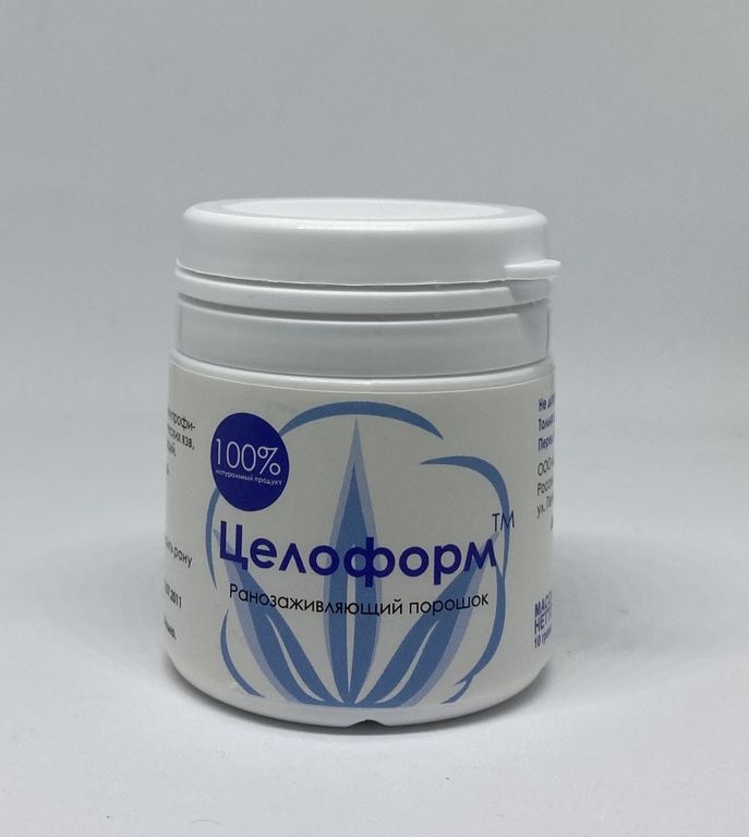 Целоформ 10 г. - порошок сорбент. Ранозаживляющий, болеутоляющий, снимающий раздражение, не аллергичный, не содержащий антибиотиков и химических добавок.Удобная расфасовка для домашней аптечки, эффективно для лечения ран, язв, опрелостей, используется для снятия воспаления при депиляции.